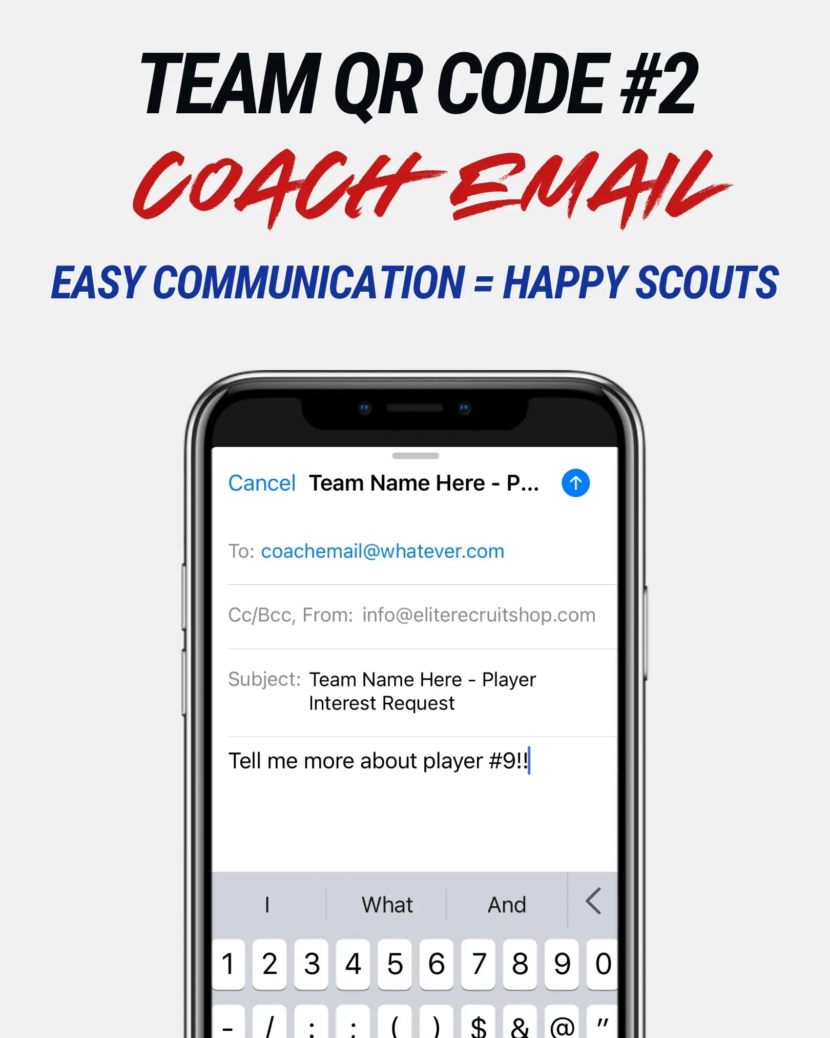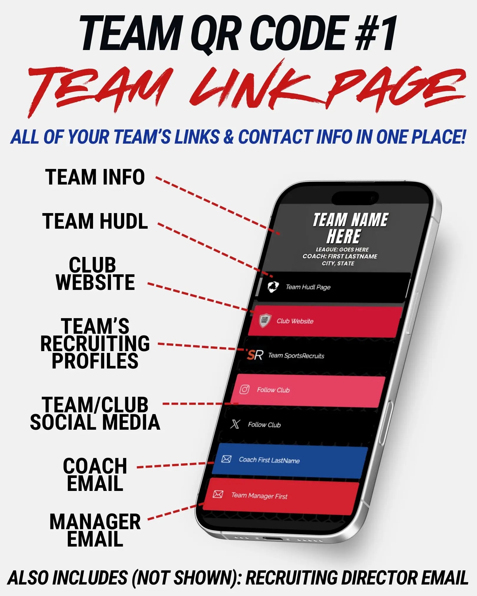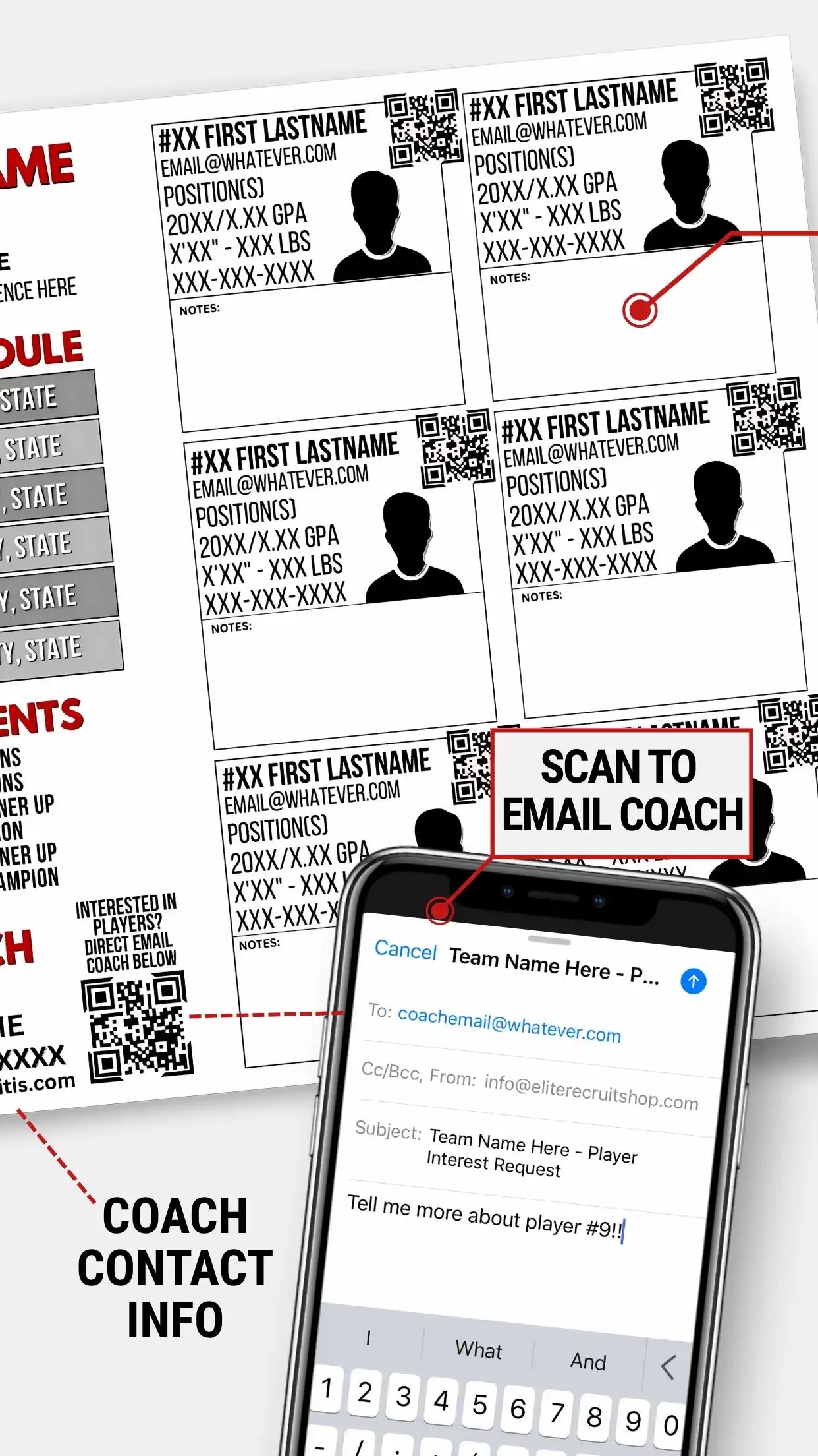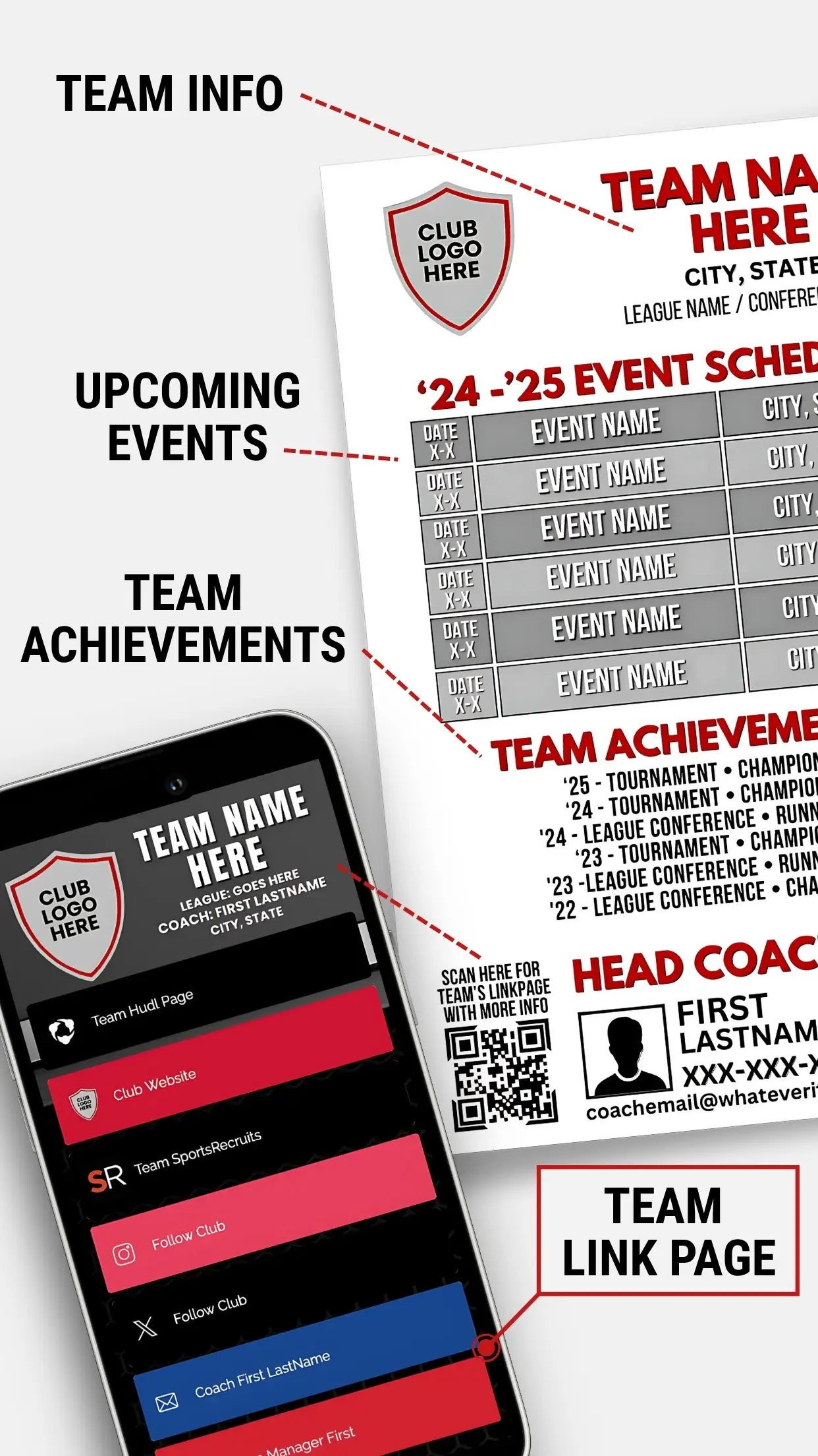 Scouts get everything they need at a glance: upcoming events, team achievements, coach contact. And an optional QR code to our Team Link Page (shown below) with links to team pages like Hudl, or SportsRecruits, manager contact info & more. Simplifying the process makes for happy scouts. First impressions stick, make yours count.