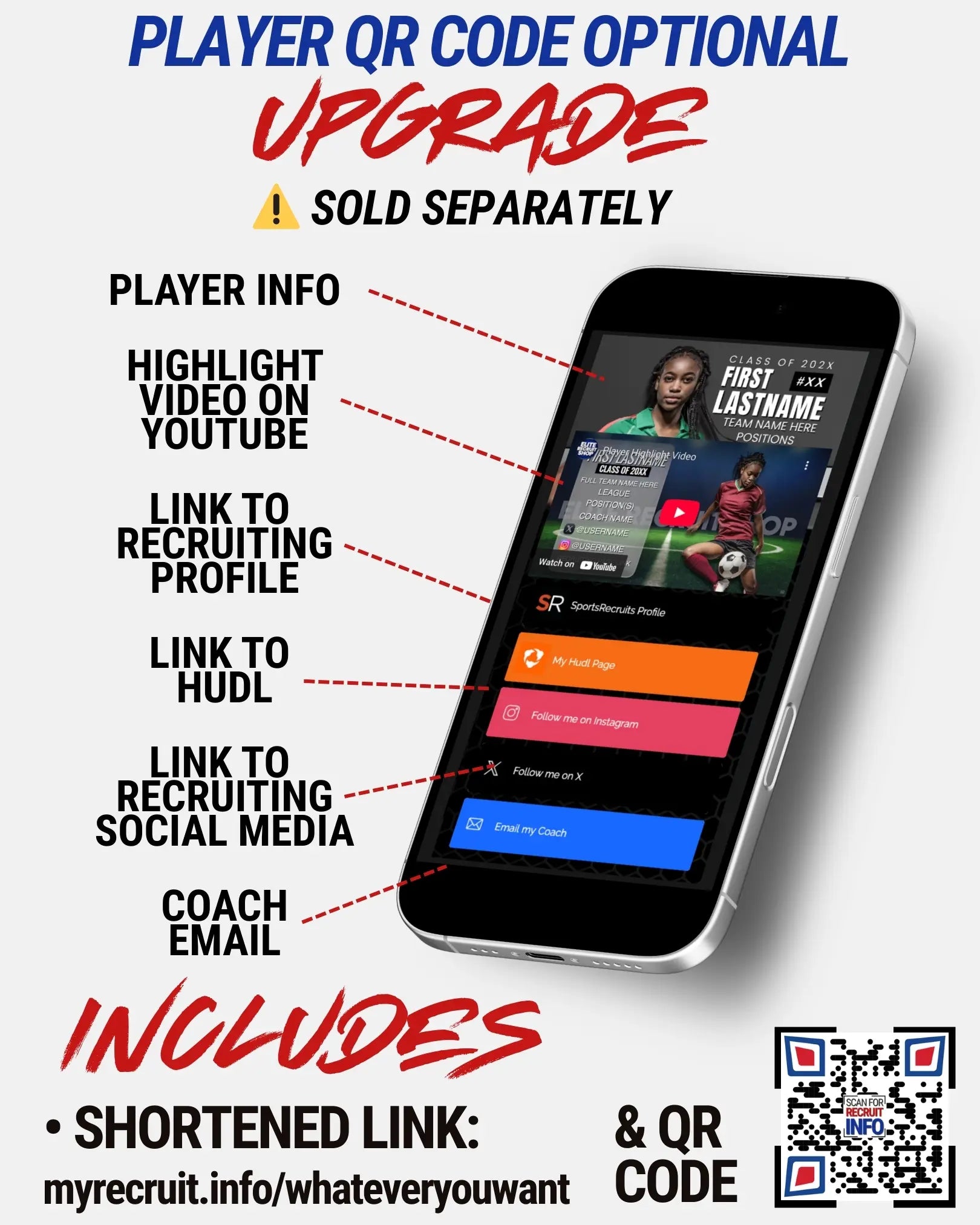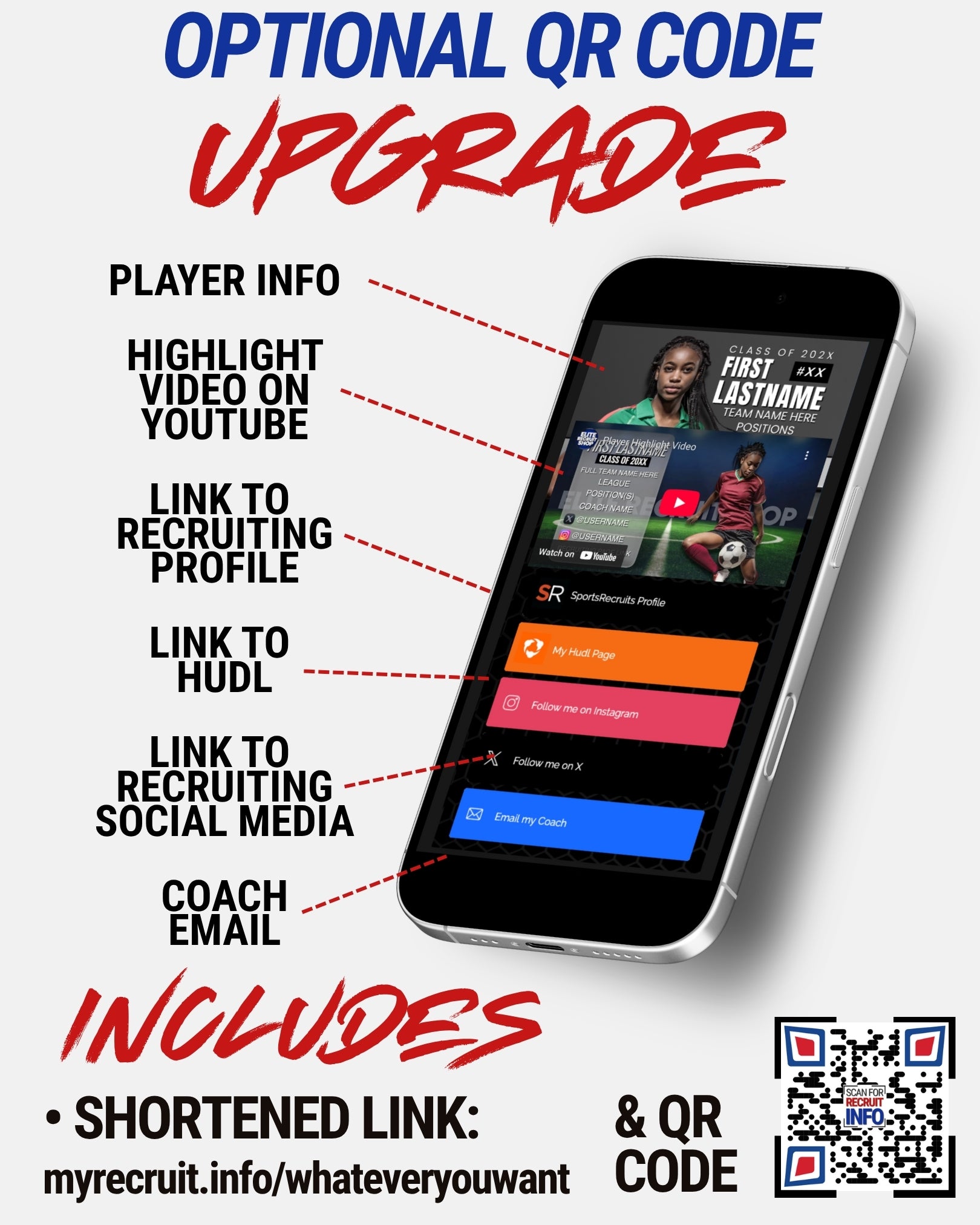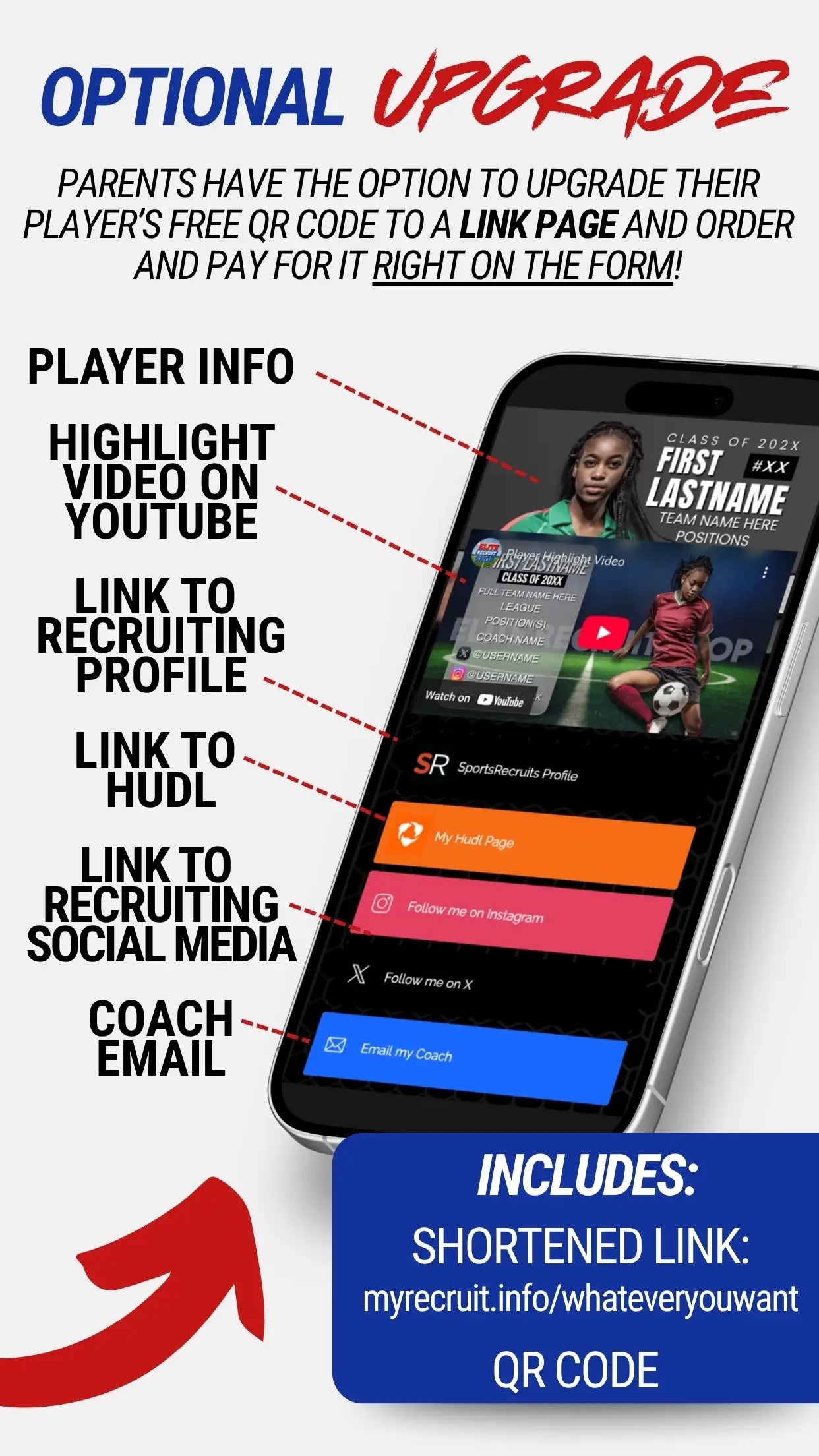 Parents have the option to upgrade their player's QR code to our Recruiting Link Page (shown below). Coaches can scan it right on the sidelines and have access to everything they need to know to follow that player's journey.