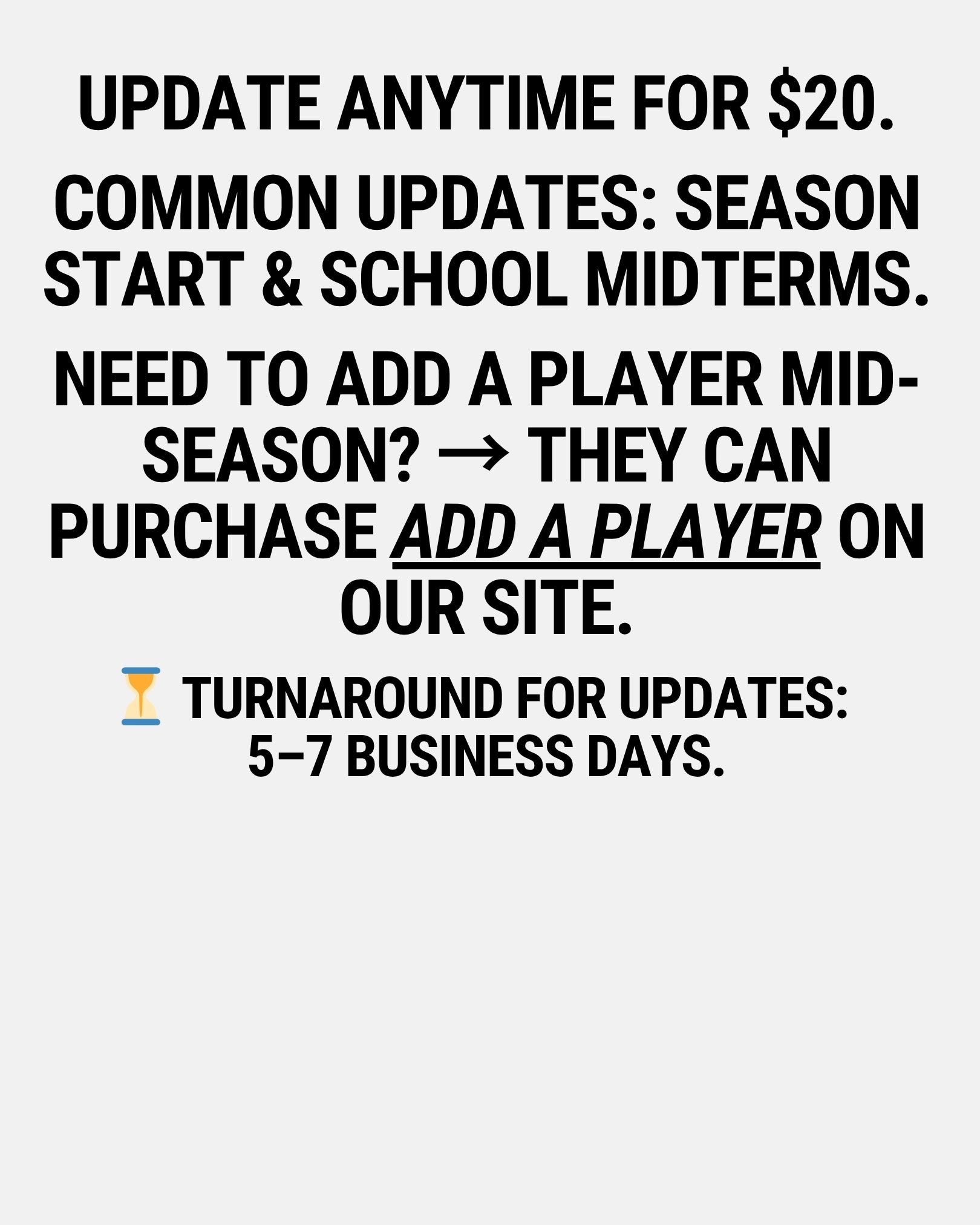 Adding a new player mid-season? No worries! Send them to our Team Recruit Flyers page where they can select Add a Player and send us their player info to be added to the flyer.
