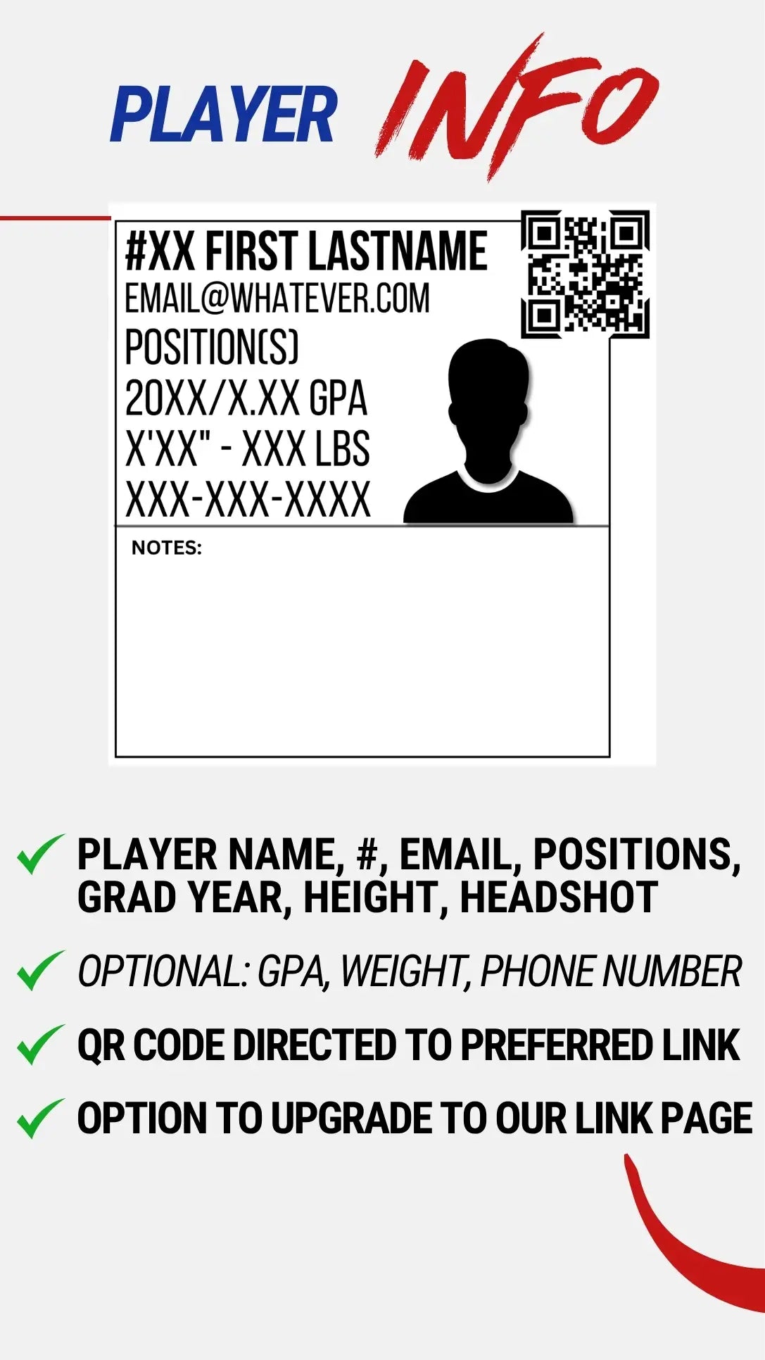 Moving forward, you can update your flyer at any time for $20. (Typically twice a year, at the beginning of the season to add/remove players & at school midterms to update GPA, Height/Weight.)