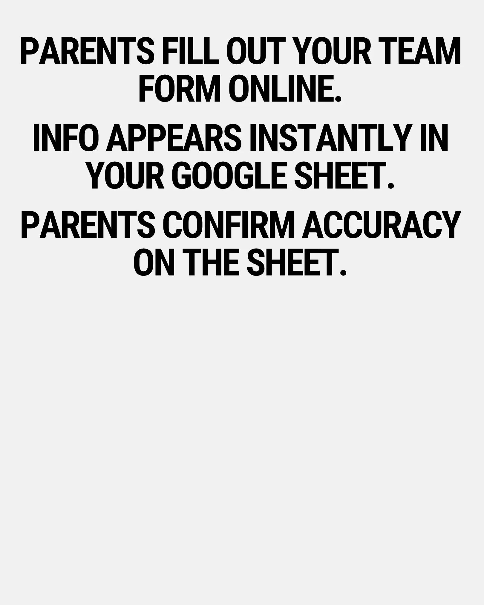 Parents will create an account and have access to your team page where they can send us their player's info, right on our form. Each entry will automatically populate your team’s Google Sheet. Parents can use the Google Sheet link in their PDF to double-check their submission and make sure their player info is correct.